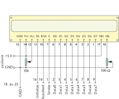 Patrząc na płytkę pierwsze styki to A i K czyli anoda i katoda do podświetlenia.