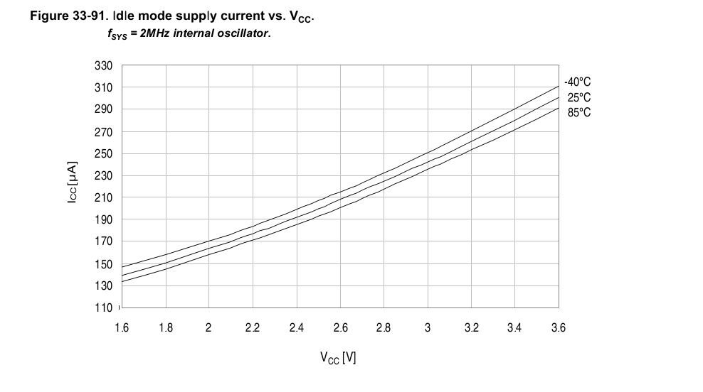 Zgodnie z danymi podanymi w datasheet, pobór przez układ zasilany z 3.3V w trybie IDLE z zegarem wew 2MHz powinien wynosić około 270uA.