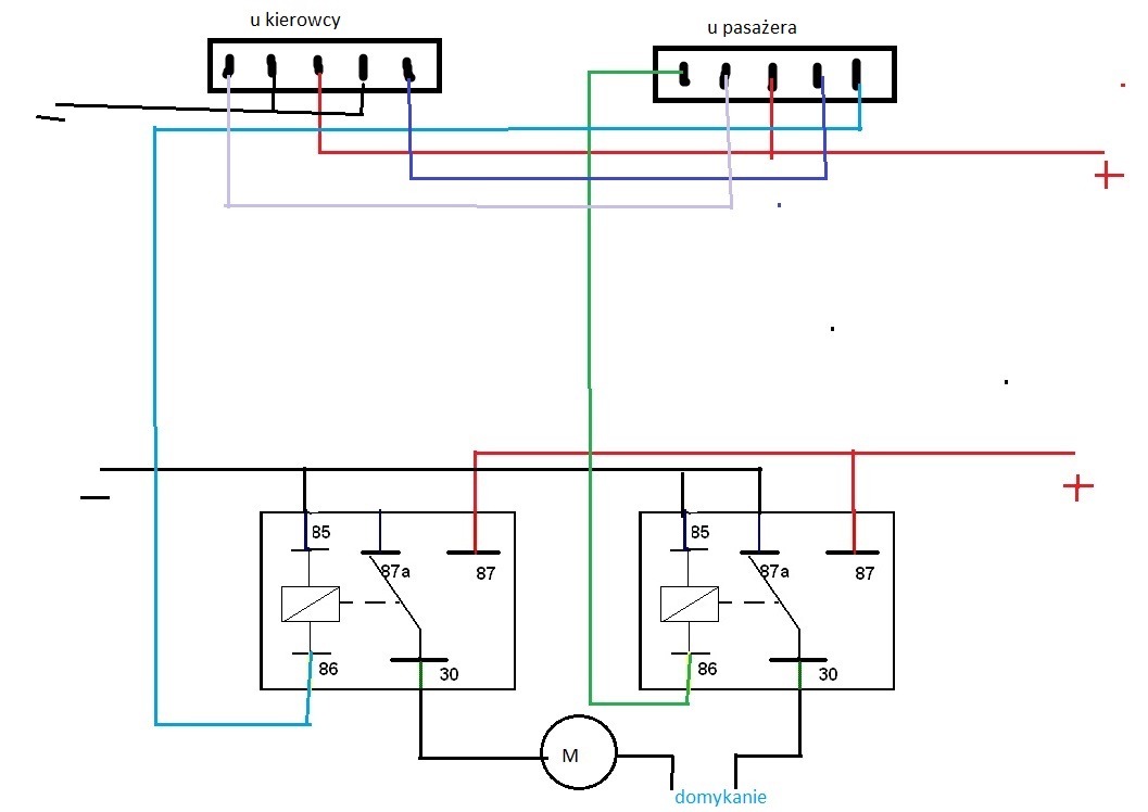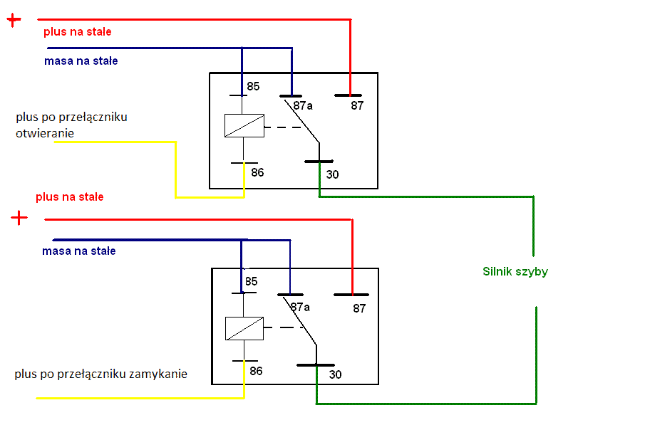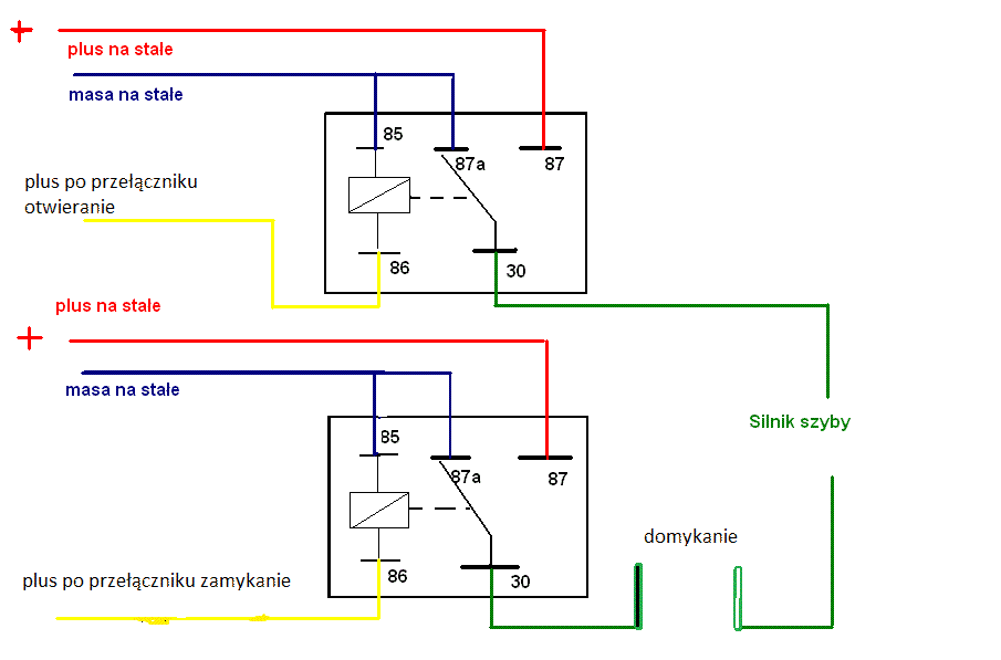 Mam problem z podłączeniem domykania szyb. Póki nie miałem przekaźników wszystko było ok, jednak teraz sprawa mi się komplikuje bo jakbym nie podłączył to przy zamykaniu robi mi zwarcie