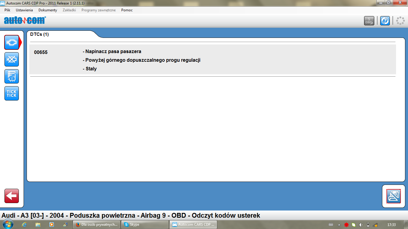 Witam,nie mogę sobie poradzić z błędem poduszek,miedzy innymi na kompie wyrzuca mi błąd napinacza pasów bezpieczeństwa,sprawdzałem kostki które maja być podpięte do napinacza pasa,jak i od strony pasażera i kierowcy są one oryginalnie zaizolowane i odłączone od pasów,wcześniej tego błędu nie miałem pokazał się około miesiąca temu,dodam ze wszystkie kostki posprawdzałem i wygląda na to ze wszytko niby jest ok.Po usunięciu błędu vagiem,błąd pokazuje się ponownie po 10 sekundach.Zdjęcie błędu oraz opis w załączonym zdjęciu.