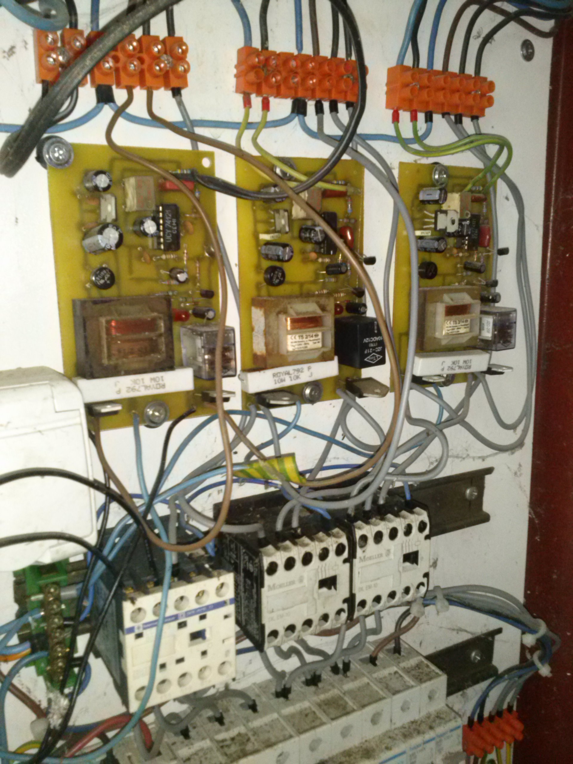 Ostatnio zostałem poproszony o naprawę dość starego mechanizmu dzwonów kościelnych. Napęd tych dzwonów opiera się na elektromagnesie. Całość jest sterowana przez styczniki, niestety żadnego schematu instalacji nie ma. Chciałbym się was poradzić co oprócz awari stycznika mogło się tam zepsuć. Mam jeszcze do was pytanie do czego służą te 3 płytki w tej skrzynce? Obstawiam że to są falowniki.