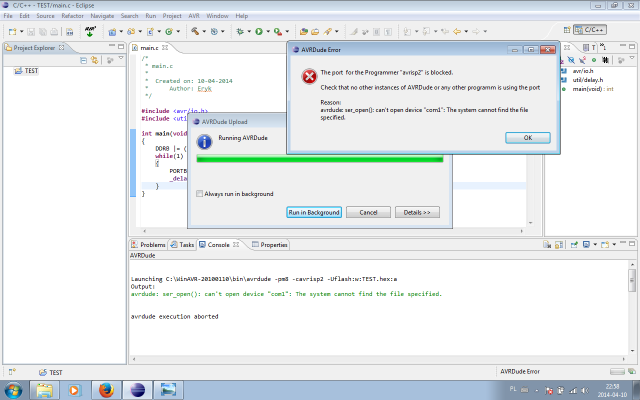 "The port for the Programmer "avrisp2" is blocked. Check that no other instances od AVRDude or any other program is using the port. Reason: avrdude: ser_open():can't open device"\\.\com1": Nie można odnaleźć określonego pliku."