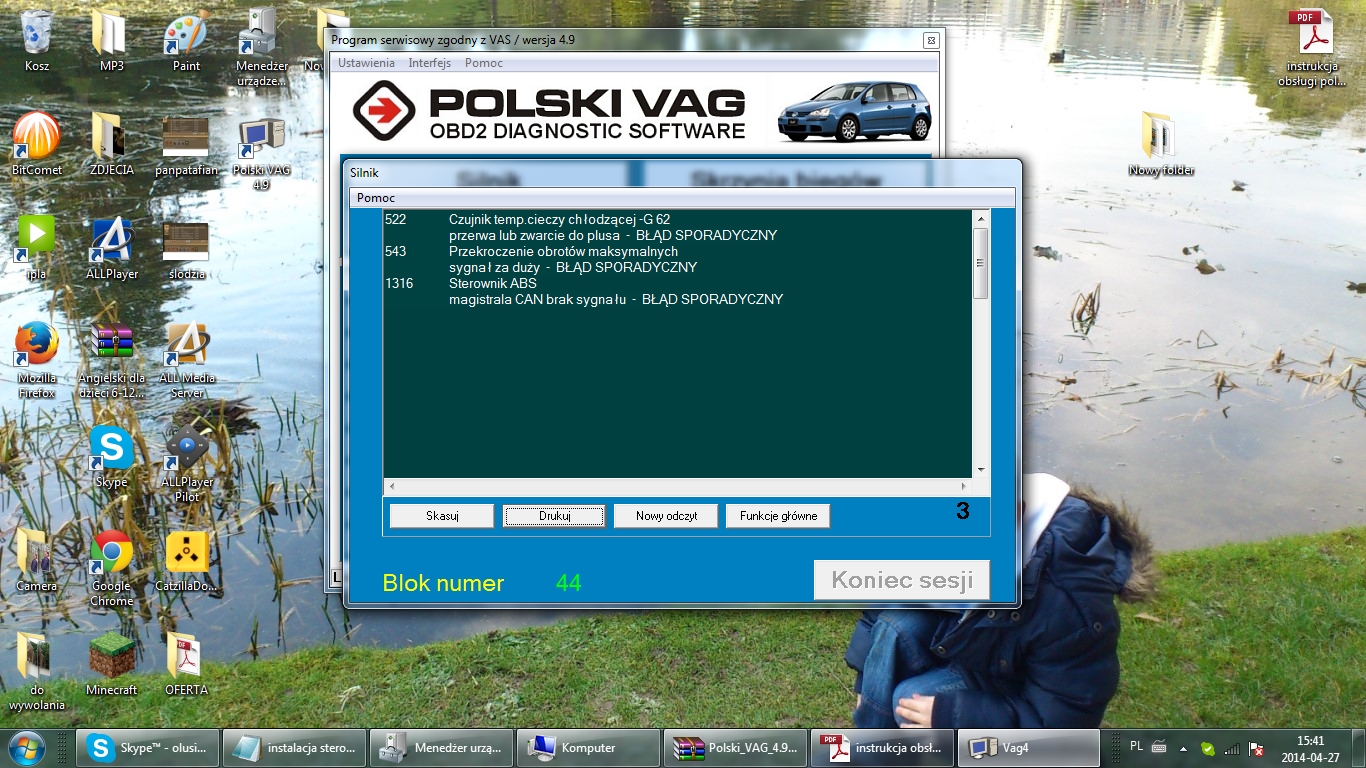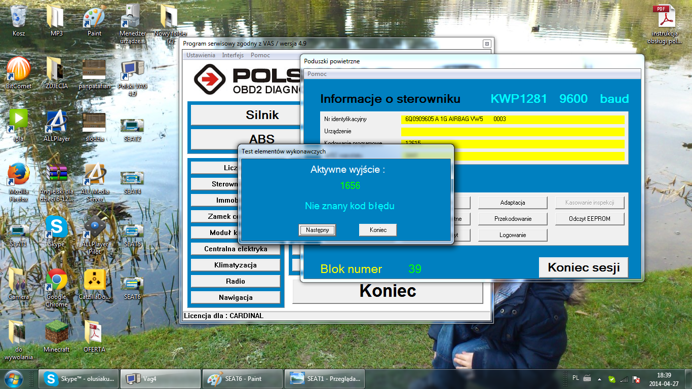 Ale dziś popróbowałem zakładki w Vag'u "test wyjść" - wszędzie test przechodził bez problemu, poza zakładką w "poduszka powietrzna" tam uruchomienie zakładki skutkuje dźwiękiem otwierania drzwi ( centalnego zamka, który nawiasem mówiąc też raz działa raz nie ) oraz zgaszeniem silnika wraz z wywaleniem błędu "Aktywne wyjście -1656, nie znany kod błędu", normalnie nie zwróciłbym na to uwagi ale właśnie po tym teście występują problemy z uruchomieniem silnika, i tu moje pytanie, czy problemem z zapłonem może być czujnik uderzeniowy ? ( wiem że kiedyś z przodu auto było lekko bite ), nie wiem czy poprawnie go zlokalizowałem ( jeżeli nie to prosze o podanie właściwego miejsca ) ale znalazłem coś niebieskiego podobnego do dużej zapalniczki, z żółtą wtyczką pod siedzeniem pasażera, obite to jest gąbką ale ta jest cała mokra