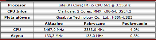 zauważyłem że procesor sam się podkręcił z 3,33MHz na 3,46MHz. (w załączniku zdjęcie z OCCT)