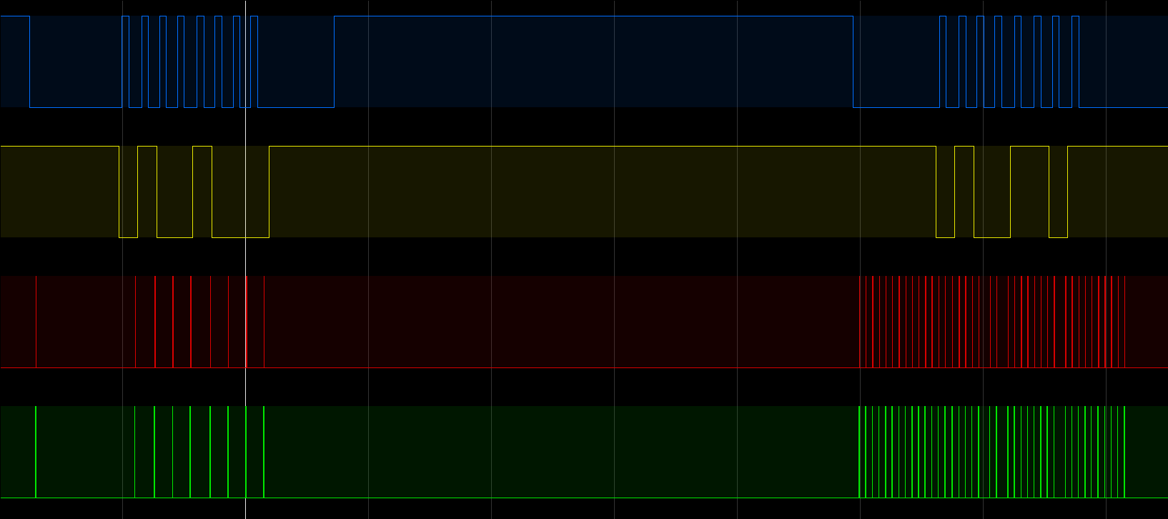 A tutaj zamieszczam wynik działania tego programu zarejestrowany analizatorem stanów logicznych . Kolor żółty i niebieski to transmisja . Przerwanie ma być wyzwalane sygnałem niebieskim (zbocze opadające ) Sygnały czerwony i zielony to wyzwolenie przerwania .