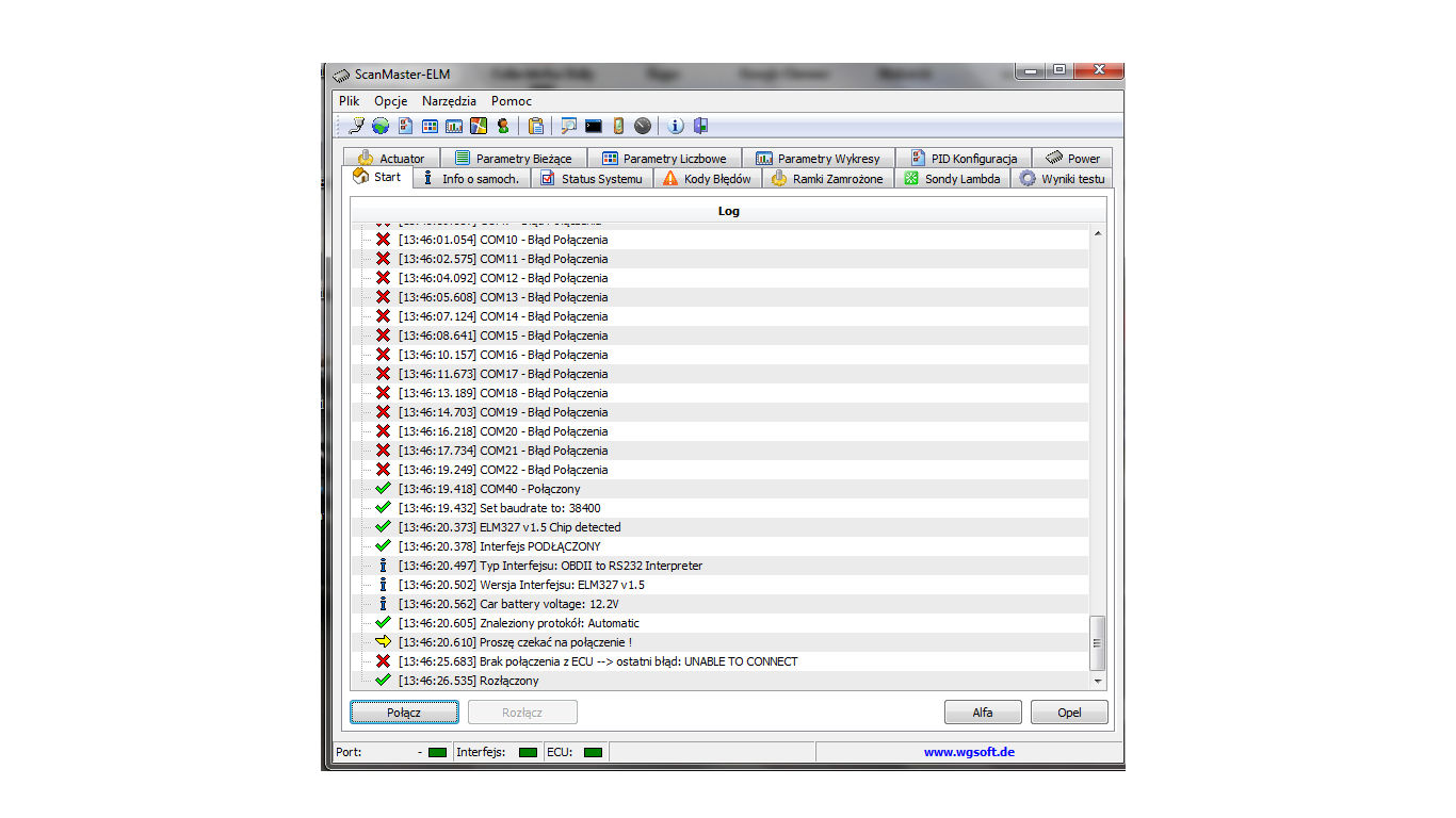 Skoro 1.1MPI to centralka jest IAW-59F lub nowsza. Jak najbardziej ELM-327 się do tego nadaje, tylko nie z tym programem. Program połączył się z interfejsem ale interfejs nie połączył się z samochodem.