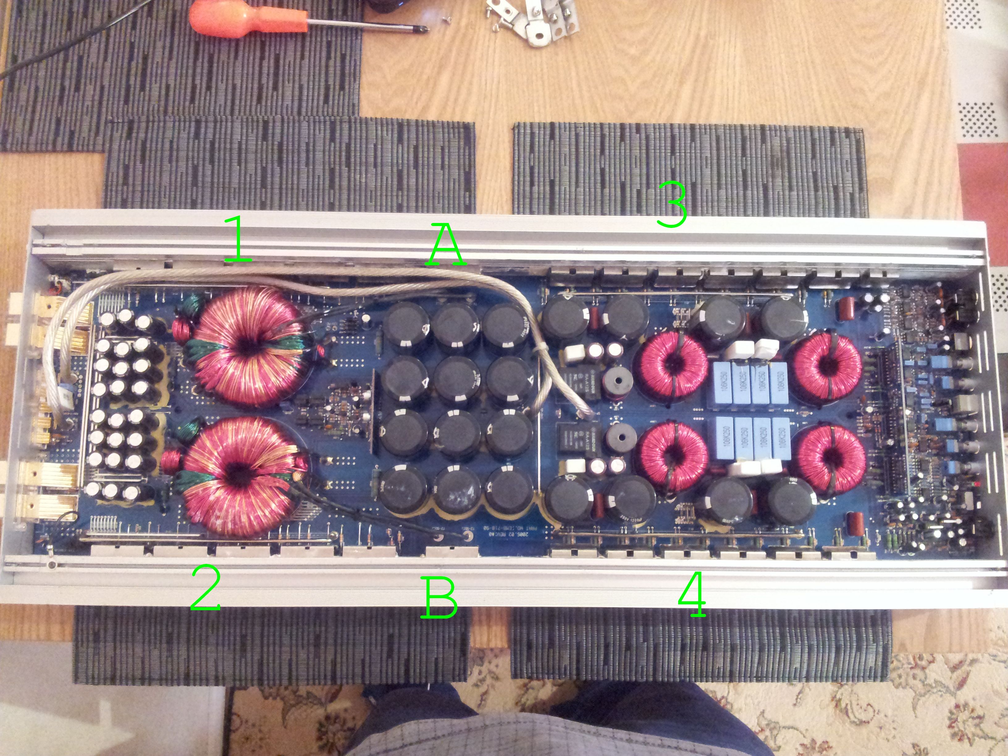 Oddałem i prosiłem, by podłączyć do auta. Podłączyliśmy zasilanie i dopiero po podpięciu wejścia remote wzmacniacz się zwarł i spaliło bezpiecznik. Otworzyłem ponownie i tym razem okazało się, że spaliły się tranzystory po jednej stronie sekcji zasilacza-numer 1 na zdjęciu. Wzmacniacz wykazał pełne zwarcie między + a -.