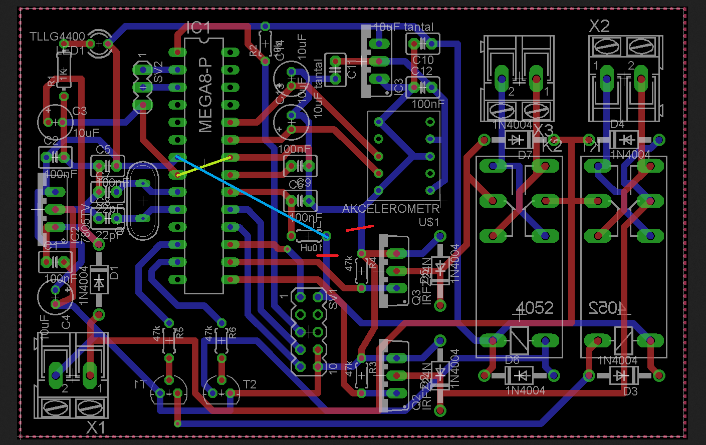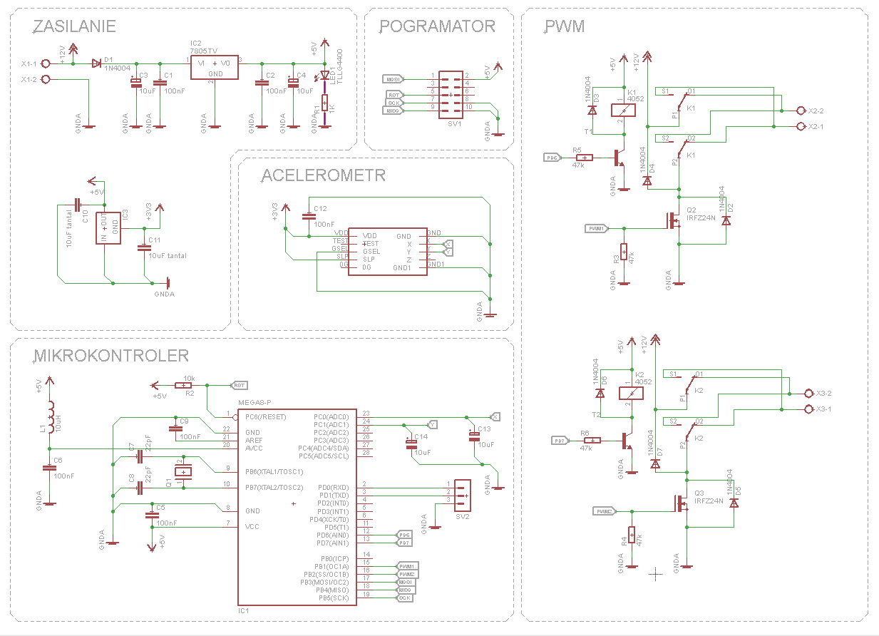 Mój problem polega na tym, iż chce sterować 2 silnikami dc 12v przez PWM z atmegi 8 i odczytuję przez ADC z akcelerometru poziom względem ziemi. Wszystko niby ładnie działa ale gdy podłącze silnik do zacisków to napięcie za stabilizatorem 7805 z 4,97 zwiększa się do 4,99 V a napięcie ze stabilizatora 3,3 V(potrzebnego do zasilania akcelerometru) zmienia się z 3,27 na 3,3 V. Problem polega na tym że gdy silniki nie pracują mam jedne napięcie (4,97 i 3,27) a jak silnik pracuje to 4.99-5V i 3,3V co sprawia że odczyty z akcelerometru się zmieniają.
