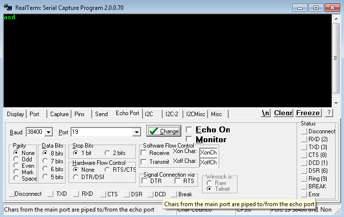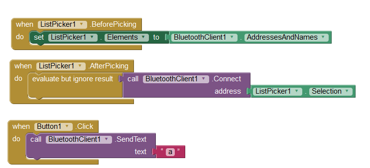 Działanie jest proste, ma wysłać do modułu BT HC-05 znak "a". Połączenie przebiega prawidłowo, moduł jest znajdowany przez telefon i sparowany.