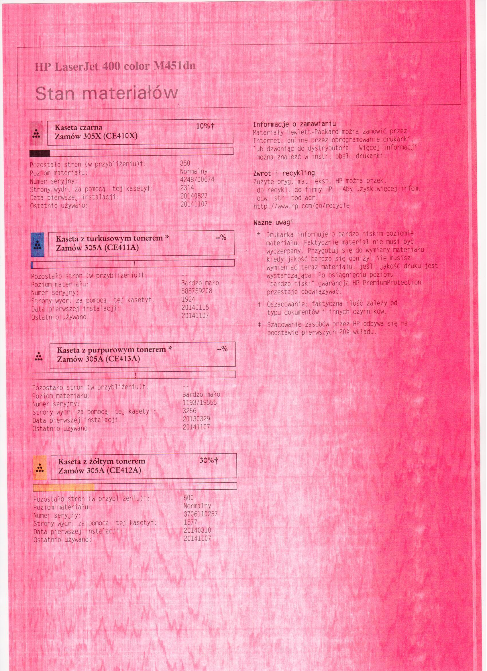 Po napełnieniu tonera "purpurowy kolor" jak widać na zamieszczonym załączniku brudzi kartki. Jak można rozwiązać ten problem? Gdzie popełniłem błąd?