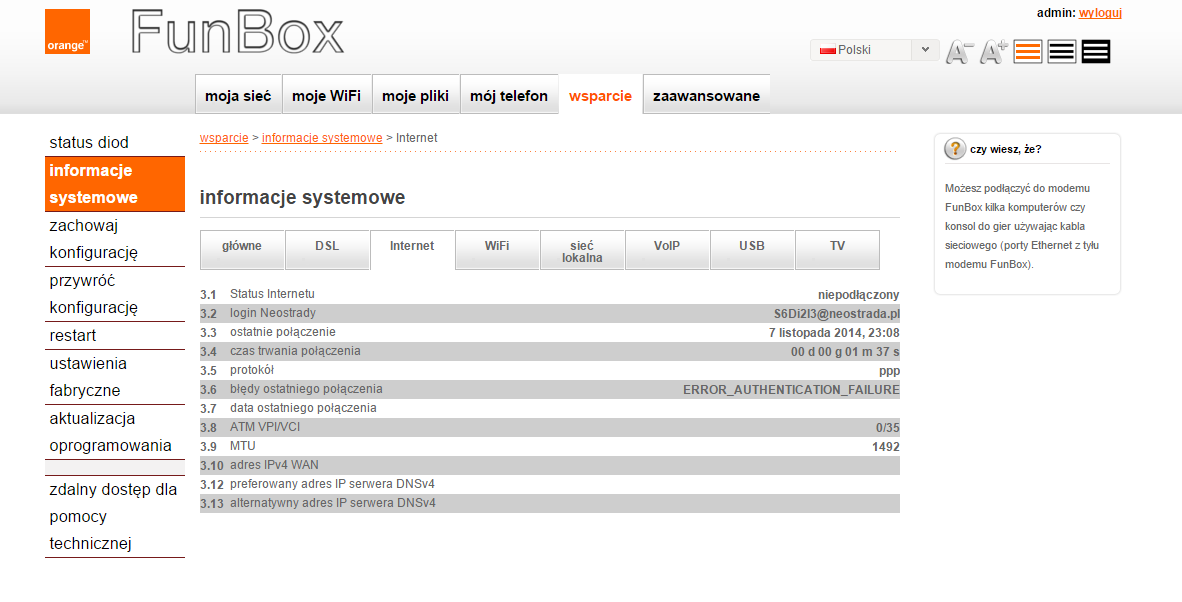 Na drugim obrazku pokazuje co zdarza się też często, czyli błąd :Error authentication. Jakby był ciągły problem z logowaniem, loginu i hasła nikt nie rusza więc nie daje sobie wmówić od osób z infolinii że mam wpisane złe hasło.