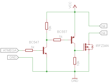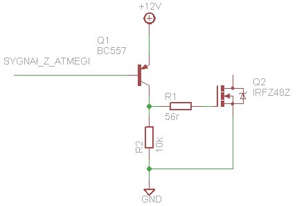 Witam. Jestem początkujący w świecie elektroniki. Mam problem z którym nie wiem jak mogę sobie poradzić. Potrzebuję z pomocą atmegi sterować żarówką H4 (zmiana świateł : mijania-drogowe) jako tranzystory wykonawcze planuje użyć tranzystory irfz34n. Wiem że aby całkowicie otworzyć tranzystor mosfet potrzeba potrzeba wprowadzić na jego bramkę napięcia równe napięciu zasilania lub nawet większe. Niestety już zakupiłem w.w. tranzystory i jestem zmuszony ich użyć. Problemem jest wysterowanie bramki tranzystora z portu atemgi ponieważ napięcie zasilania będzie równe napięciu ładowania (~14V) a jak wiadomo port atmegi w stanie wysokim daje napięcie 5v. Tu moje pytanie, jaki tranzystor zastosować pomiędzy portem atmegi a bramką tranzystora aby w pełni lub prawie w pełni go otworzyć? Bo przy napięciu brami wynoszącym 5V występują duże straty mocy. Próbowałem z tranzystorem pnp bc557. Do puki do bazy tranzystora doprowadziłem stan niski było ok. lecz gdy wprowadziłem stan wysoki aby zatkać tranzystor on dalej przewodził. Połączenie wygląda w ten sposób że : z portu atmegi przez rezystor 1kohm steruję bazą tranzystora pnp, do kolektora podłączyłem 12v, emiter przez rezystor 56ohm podłączyłem z bramką tranzystora mosfet, źródło podłączyłem do masy a żarówkę z jednej strony do drenu a z drugiej do zasilania 12v . Myślę że zamieściłem temat w odpowiednim dziale oraz wszystko wyjaśniłem. Jeśli niewłaściwy dział to proszę o przeniesienie. Pozdrawiam Michał.