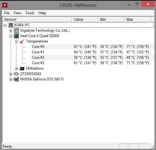 Ostatnio w komputerze zmieniłem kartę graficzną. Z geforce 9600 GT na asus geforce 560 TI. Moje pytanie brzmi, czy karta i procesor nie mają za wysokich temperatur ? Poniżej zamieszam screen komputera w stanie normalnym użytkowym, czyli przeglądarka itd..., drugi screen dotyczy temperatur po 40 minutach grania w Far Cry 4 na niskich detalach. Procesor to quad 9300.