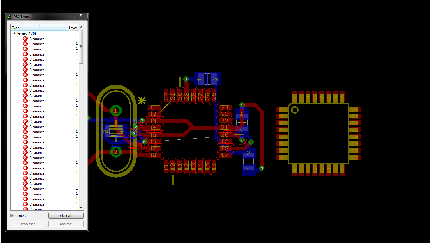 DRC mam skonfigurowane dla odstępu 8mil, między padami atmegi jest jakies 13-14 milsów odstępu, a jednak wskazuje tam błędy. Dla pozostałych elementów na płytce mam podobne problemy. Dlaczego tak jest?