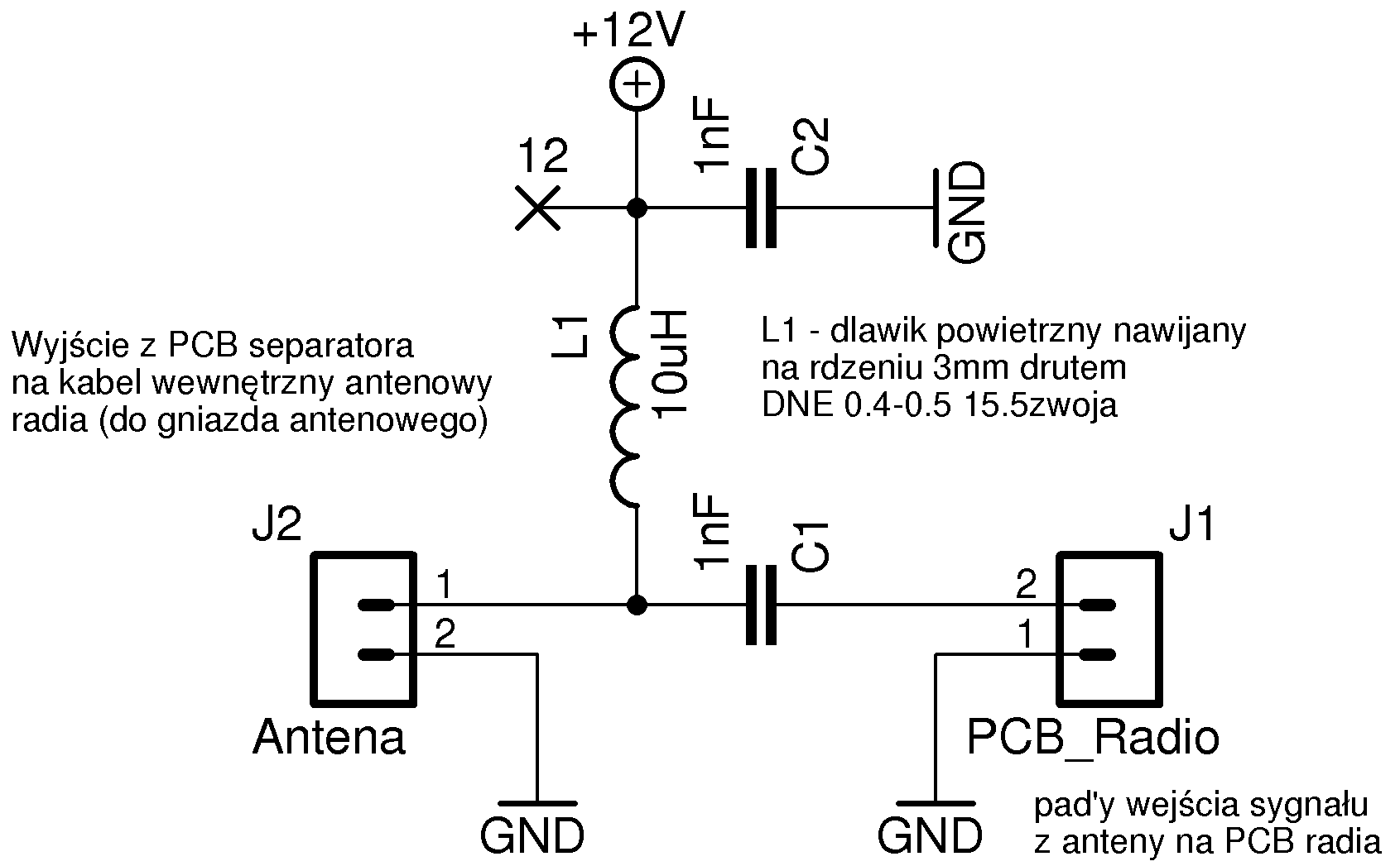 Wcześniej gadał pięknie z kasetowym Blaupunktem Flensburg CC28, ale w radyjku skończył się złożony potencjometr. Włożyłem wczesnego Pioneera z odtwarzaczem CD, od razu spadła ilość odbieranych stacji i jakość sygnału. Doczytałem, że na dachu jest krótka antena, a pod nią wzmacniacz antenowy, do którego należy puścić zasilanie środkowym przewodem kabla koncentrycznego. Wykonałem separator jak na obrazku (proszę się nie sugerować wartością dławika, prawdziwy jest opis jego wykonania):