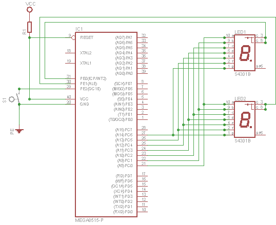 Od strony kodu oczywiście zamierzam bardzo szybko "przełączać" obie cyferki, tak, by wykorzystać tylko te 7 + 2 pinów do sterowania całym podwójnym segmentem wyświetlacza.