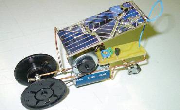 Na stronie http://www.delta4.info/ znaleziono ciekawe, trochę śmieszne i nietopowe rozwiązanie robota solarnego - zasilanego z energii słonecznej. Do budowy ogniwa wykorzystano 10 ogni słonecznych o wymiarach 10x20mm i napięciu 0,6V. Otrzymano w ten sposób ogniwo 6V o wytrzymałości prądowej około 100mA. Kondensator C1 posiada pojemność 1F tzw backup o napięciu 6,3V, jednak jak widać na foto wykorzystano kondensator 10.000uF 6,3V. Baterie słoneczne, kondensator o dużej pojemności powodują, że konstrukcja nie należy do najtańszych...