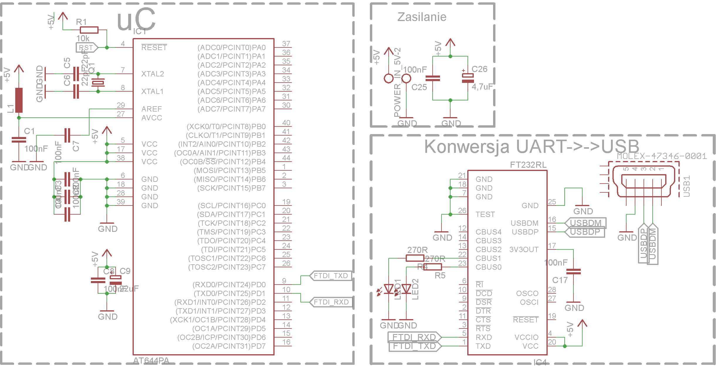 Mam prośbę o sprawdzenie schematu (poniżej_. Układ ma służyć do komunikacji ATMEGA<>PC przy użyciu FT232RL, ale układ nie ma byc zasilany z portu USB, ma on swój własny zasilacz (zaznaczone na schemacie napięcie zasilające "+5V").