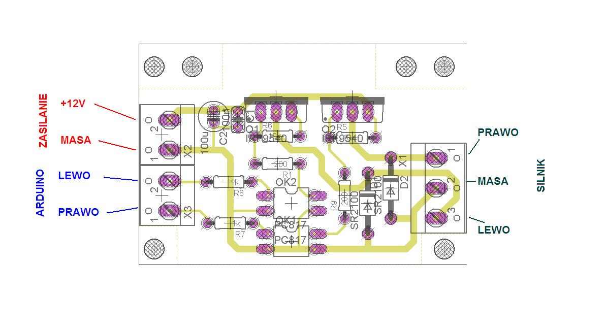 Wstępny schemat (nad końcowym jeszcze pracuję) znajduje się w pliku .pdf. Elementy ARD1....ARD7 to wyprowadzenia do podłączenia arduino mega 2560 - najlepiej goldpiny. LCD1 ...LCD4 to wyprowadzenia na wyświetlacz 2,8 ITDB02 - najlepiej goldpiny. druk_ster, tensometry, klawiatura to wtyki IDC do których podpinałem odpowiednio szeroką taśmę. Możliwe jest zastosowanie innych wtyczek, które w miarę łatwy sposób pozwolą na odpinanie tych elementów, ale musi to być jednolita wtyczka żeby nie pomylić przewodów. Dwa stabilizatory napięcia, kilka kondensatorów, diod, tranzystor BUZ11 (finalnie będą trzy). W miejscach gdzie wyprowadzone są złącza ARC: SILNIK_POMPY i PRAWO_LEWO podpięte były układy przedstawione na pozostałych zdjęciach. Trzeba je wkomponować na jedną płytkę.
