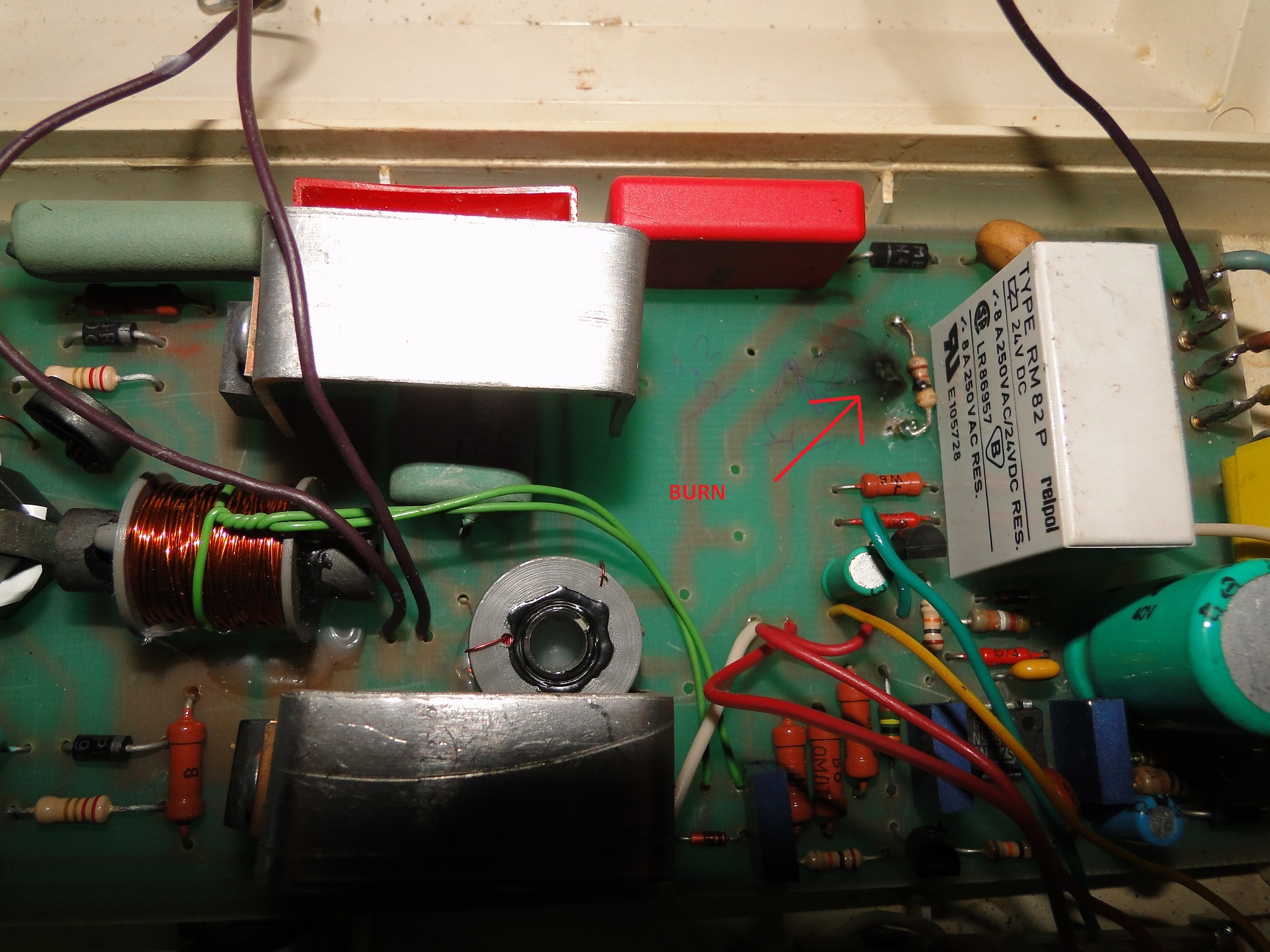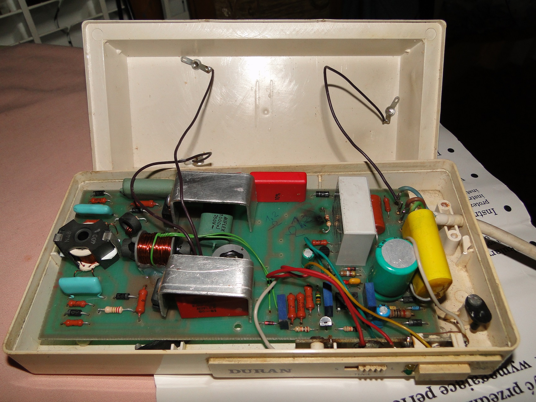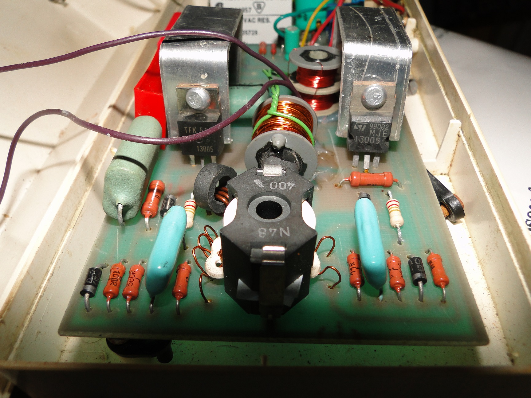 Myjka jest wiekowa (PRL) aczkolwiek wewnątrz solidnie wykonana. Nie ma opisanych elementów na płycie głównej. Jest tylko napis "WIEL" i model płyty "1P1001". Po włączeniu (kilkanaście lat przeleżała w piwnicy) okazało się, że nie działa. Spalony był rezystor (widoczny na fot.3) i jeden z tranzystorów MJE13005. Wymieniłem spalone elementy. Po włączeniu myjka pracowała chwilę ok. 15sek i 'smrodek'. Zaglądam do środka i sytuacja się powtórzyła. Opornik i jeden MJE13005 spalone. Dodatkowo sprawdzone diody i rezystory - OK. Nie wiem tylko czy ta zworka powinna być na płycie (zaznaczona na fot.4). Nigdzie schematu znaleźć nie mogę ani żadnego opisu tegoż oto urządzenia. Stąd moje zapytanie tutaj. Myjkę chcę używać do czyszczenia monet i innych drobnych rzeczy.
