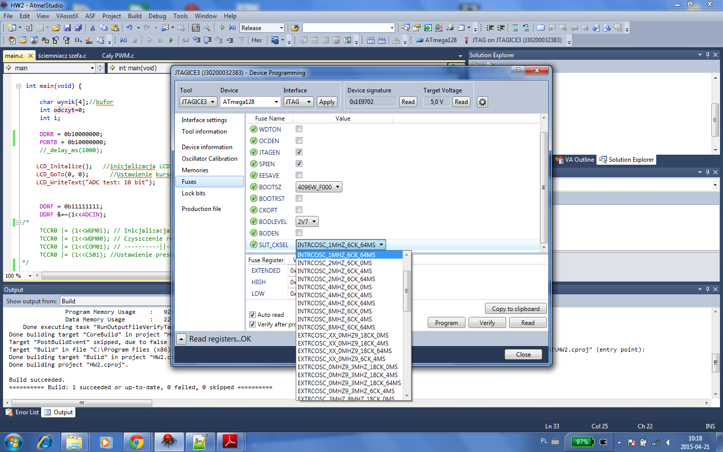 W kodzie zmieniłem tylko jako że mam Mege128 pin wejścia ADC na PF0 i napięcie z AVCC