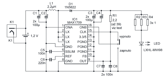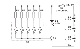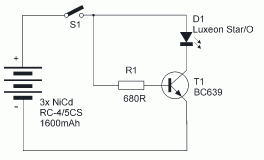 Przykład układu umożliwiającego stabilizowanie prądu. Zasilanie z 3 akumulatorków, typowo 3.6V.