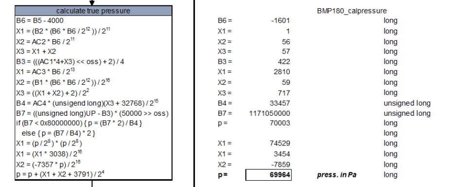 W celu wyliczenia cisnienia z czujnika Bmp180 należy wykonać obliczenia z użyciem liczby unsigned long ; poniżej fragment algorytmu w c