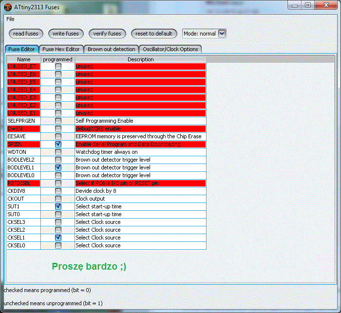 Po pierwszej próbie - zacząłem od ustawienia fusebitów wg opisu: