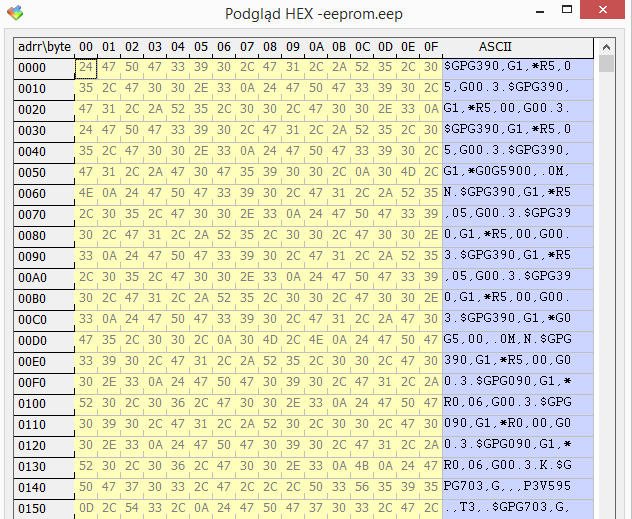Dane, które zapisują się do EEPROM dodałem w załączniku. Wygląda jakby początek ramki ($GPG) zapisywał się poprawnie, natomiast później pojawiają się śmieci.