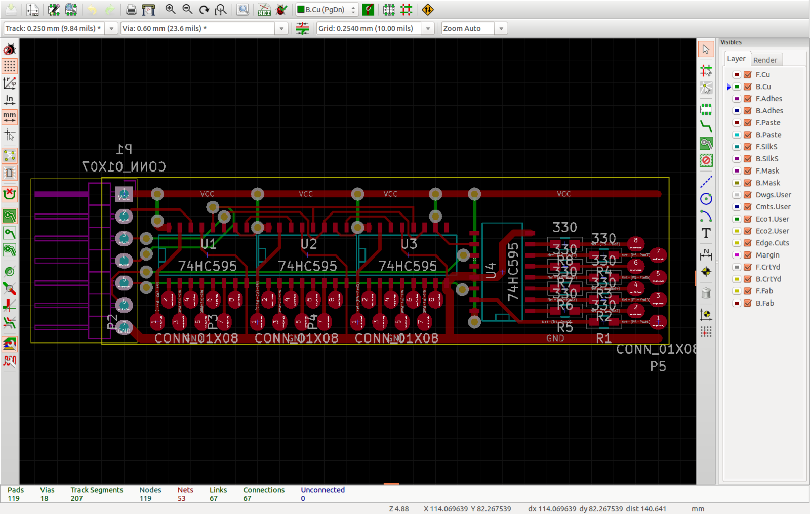 Poniżej możemy podziwiać film i zdjęcia z budowy projektu podświetlanych okularów. Na stronie źródłowej brak jest szczegółowego opisu projektu, jednak z samych zdjęć, krótkich komentarzy na stronie z galerią projektu oraz na youtube można nieco wywnioskować. Same okulary zbudowane są w oparciu o moduł Arduino micro (ale tylko na razie) oraz zaprojektowany przez autora w eagle'u obwód drukowany z rejestrami przesuwnymi 74HC595. W centrum uwagi projektu są oczywiście 122 diody LED w obudowach SMD, które w dosyć pracochłonny sposób zostały przylutowane najpierw na pająku zrobionym na bazie przewodu nawojowego, a następnie umieszczone na okularach, najprawdopodobniej przy użyciu gorącego kleju. Póki co, obwód z rejestrami przesuwnymi przymocowany jest z boku okularów i połączony przewodem taśmowym z modułem Arduino. Poniżej znajdziecie film pokazujący wyświetlane testowe sekwencje świetlne.