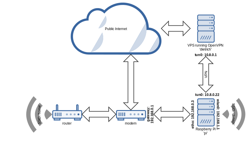 Powyżej pokazany jest schemat sieci domowej autora. Jak widać serwer na RPi egzystuje w trzech sieciach - LAN, VPN oraz we własnej sieci WiFi o SSID 'dietrich', która ma za zadanie przekierować ruch na VPN.