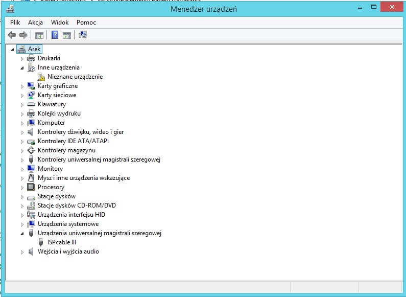 Mianowicie na początku komputer nie był w stanie zainstalować automatycznie sterowników do ISPcable (nie posiadam żadnej płyty ze sterownikami). Na stronie producenta (PROPOX) linki do systemów 64bitowych (posiadam WIN 8.1) nie działają. Po kilku godzinach poszukiwań znalazłem program zadig, który zainstalował sterowniki do ISPcable III. Jednak nie powstał żaden wirtualny port COM (podobno powinien taki powstać). I mimo, że ISPcable III został zainstalowany (płytka z ATmegą została zasilona po instalacji sterowników, przed instalacją nie dostawała nawet zasialnia) do nie mogę wgrać programu. AVRstudio nie wykrywa żadnego mikrokontrolera, a przy łączeniu (Przycisk connect) wypróbowałem wszystkie możliwe opcje (pojawia się napis "finish upgrading before reconnect", lecz uważam że problem leży w braku wirtualnego portu COM)