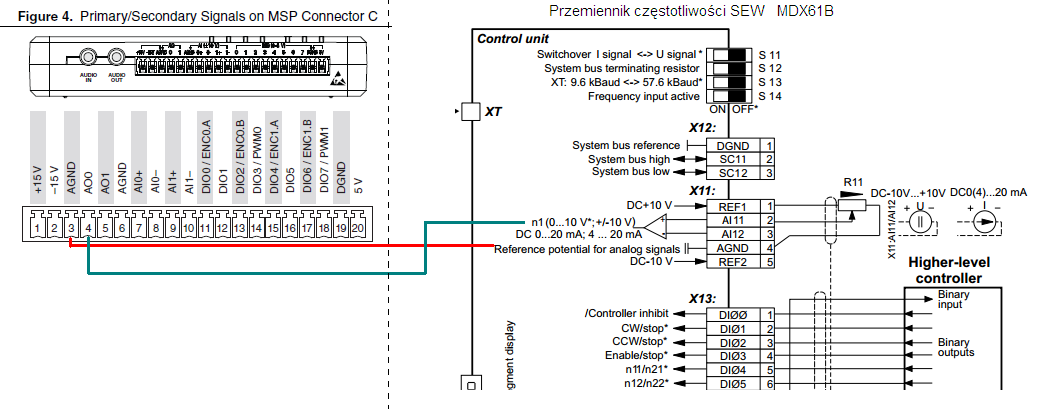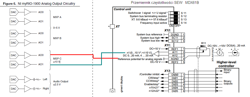 Chciałbym sterować falownikiem przy użyciu sterownika NI myRIO 1900. Chciałbym wykorzystać jego wyjście analogowe. W związku z tym mam pytanie czy można połączyć wyjście sterownika z wejściem falowniku w sposób jak na obrazku?