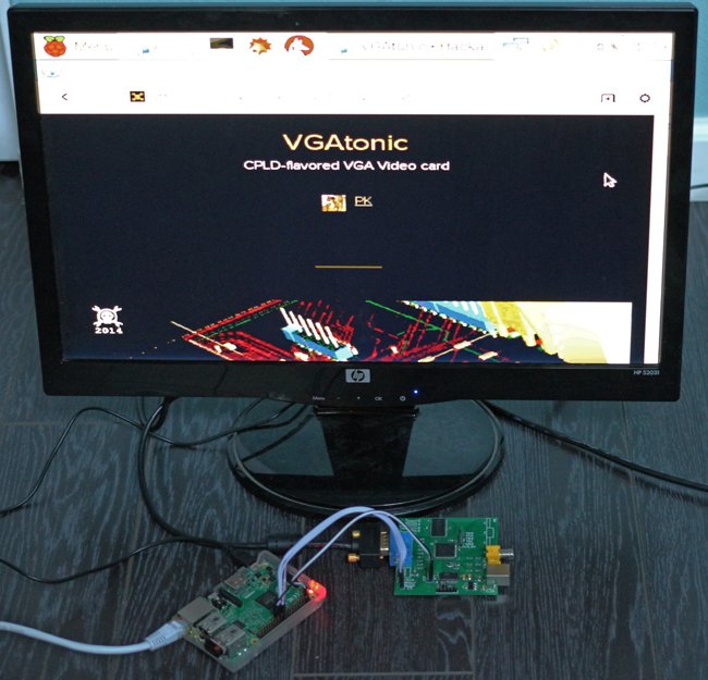 VGATronic version 2 została zbudowana w oparciu o układy Xilinx XC95144XL CPLD do wyświetlnia obrazu VGA oraz mikrokontroler ATTiny2313a odpowiedzialny za odczytywanie danych przesyłanych po magistrali SPI. Karta wyposażona jest w cztery MB RAM. Całość została upakowana na obwodzie drukowanym o wielkości 3x3 cale. Na zdjęciach możecie zobaczyć swego rodzaju "Hello World" wyświetlony na ekranie monitora, a wysłany z Raspberry Pi 2.Niedawno na youtubie można było podziwiać film pokazujący DOOMa odpalonego na tym właśnie sprzęcie (aktualnie niestety film jest niedostępny).