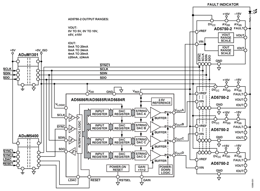 W aplikacjach wielokanałowych, gdzie konieczna jest większa niż 4 ilość kanałów wyjściowych, kilka układów AD5686R może zostać połączone szeregowo, co nie wymaga żadnych dodatkowych układów w systemie. Taka możliwość znacznie zmniejsza kosztochłonność konstrukcji wielokanałowego systemu sterującego, szczególnie, gdy wymagana jest duża liczba izolowanych galwanicznie wyjść analogowych.
