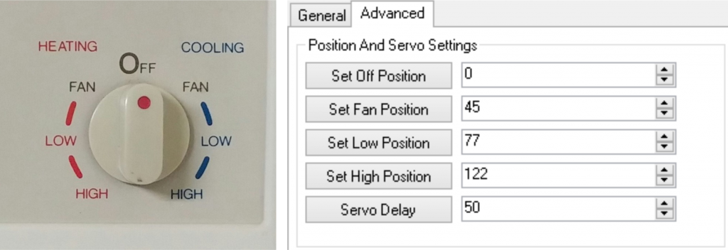 Zanim kontroler rozpocznie poprawną pracę, koniecznie trzeba skonfigurować pozycję serwomotorów. W drugiej zakładce interfejsu jest szereg przycisków, pozwalających na zrobienie tego. Pozwala to na dostosowanie serwomotoru do wykorzystywanego klimatyzatora. Naciśnięcie każdego z przycisków umożliwia także przesunięcie serwa na zadaną pozycję. Pozwala to na łatwe dostosowanie jego ruchu do danego klimatyzatora. Dane przechowywane są w pamięci EEPROM układu.