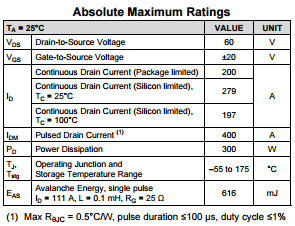 Jako przykład tych parametrów, na rys 1a i 1b umieszczono dwie tabelki z danymi dotyczącymi dwóch przykładowych tranzystorów MOSFET. Oba układy mają pierwszy limit prądu równy 200 A, ale z uwagi na niższy RDS(ON) drugiego z tranzystorów, ma on wyższy "limit krzemowy", co oznacza, że przy tym samym prądzie będzie on generował mniej ciepła niż pierwszy FET. Oczywiście żaden z zaprezentowanych układów nie jest rekomendowany do dłuższej pracy z prądem powyżej 200 A, mimo że limit krzemowy drugiego oszacowano na 349 A. W świecie FETów dłuższa praca oznacza impulsy dłuższe niż 100 ms - każdy impuls dłuższy niż ten czas można uznawać już za prąd stały.