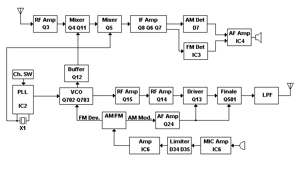 Ogranicznik modulacji masz na tranzystorze Q24. Na pewno jakiś kondensator małej pojemności i rezystor do w.cz. idzie i przy przemodulowanym sygnale sprz. zwrotne obcina amplitudę z mikrofonu (zmniejszając wzmocnienie przynajmniej części toru mikr. w AM czyli wzmocnienie najczęściej wzmacniacza m.cz. bo on daje 'moc' modulacji.