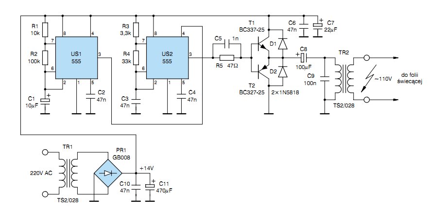Posiada ktoś schemat elektryczny układu do sterowania folią elektroluminescencyjną o powierzchni 250-400cm^2. Napięcie wejściowe jakim dysponuje to 12V DC lub 5 V DC, a chciałbym otrzymać napięcie wyjściowe 70-150V AC f=400-3000Hz. Układ może być oparty na transformatorze albo przetwornicy. Z tego co udało mi się zorientować to gotowe scalaki do tak dużych foli są niestety niedostępne, a nie chcę korzystać z gotowych inwerterów ze względu na obawę że za kilka miesięcy mogą przestać taki konkretny produkować.