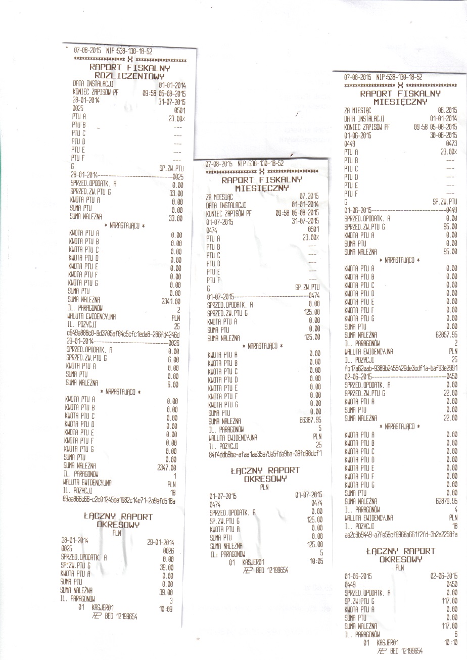 Proszę spojrzeć na zakresy dat i numerów raportów poniższego wydruku. W nagłówku jest data końcowa 31.07.2015r. z numerem raportu 0501 a w podsumowaniu 01.01.2014r. z numerem raportu 0002. Skan oryginalny nie modyfikowany. Posiadam taki oryginalny wydruk. Czy ktoś to skomentuje.