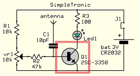 Użyty tranzystor NPN 23C3558 posiada duże wzmocnienie (hfe=300) oraz jest zaprojektowany do pracy przy częstotliwościach do 7GHz.