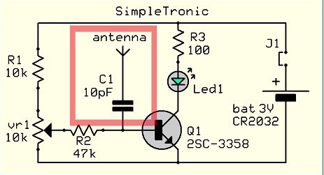 Antena (drut 10cm) odbiera fale elektromagnetyczne, a kondensator 10pF blokuje niższe częstotliwości.