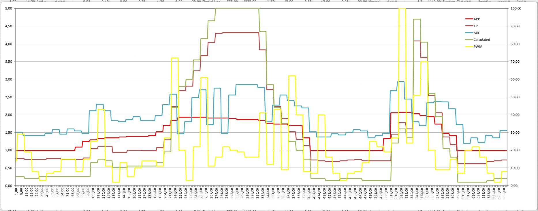 Calculated - wyliczona pozycja przepustnicy (wartości na pawej osi Y)