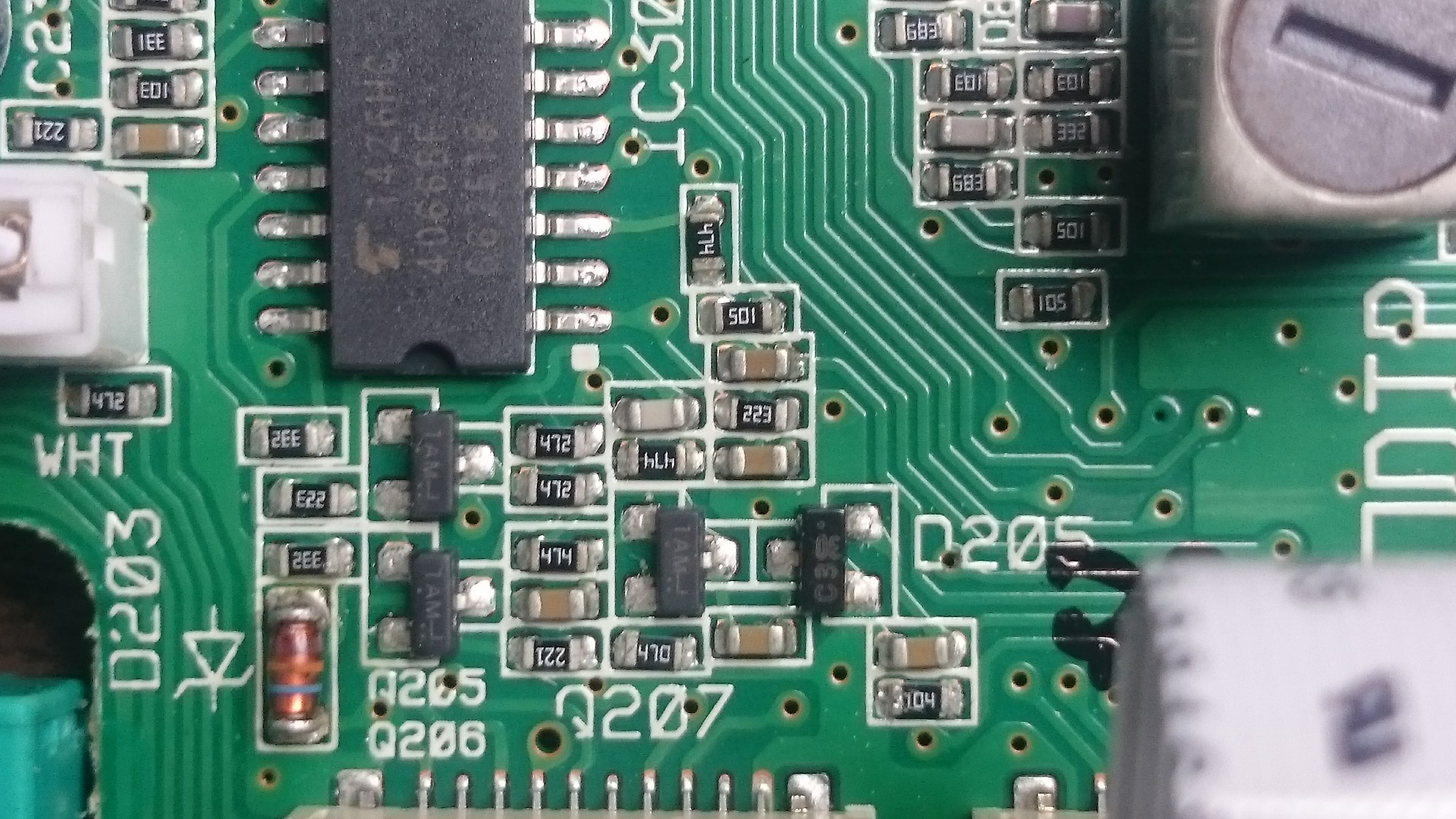 Przy PTT wyświetlacz pokazuje TX. Kiedy puszczę PTT, a nie jest włączony RB, to kanały lecą do góry. Funkcja VOX działa. Na bazie (Q203) myślę, że to 2SC4915, sinus częstotliwości ustawionego kanału jest, ale brak zasilania na emiterze. Za chol... nie mogę się dopatrzeć skąd Q203 powinien dostawać zasilanie...