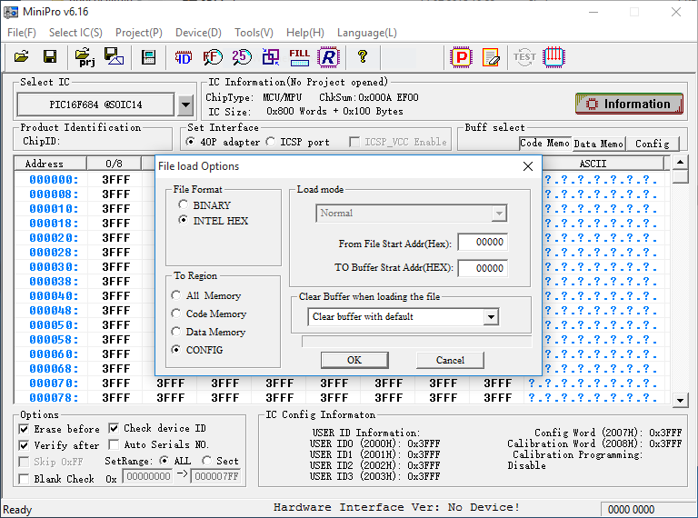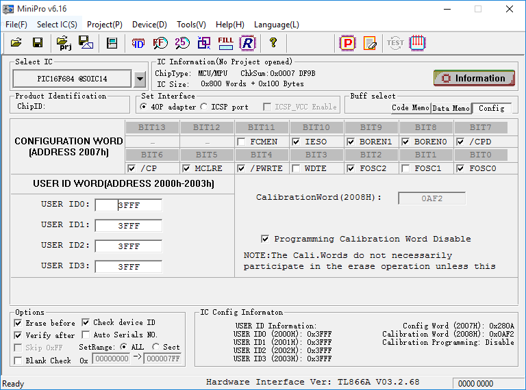 Załączam również wygląd konfiguracji bitów załączonych do wsadu oraz tych dostępnych w TL866A.