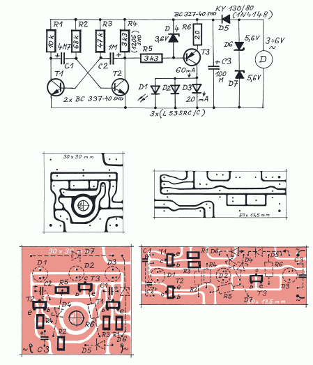 Przykład zasilania zwykłych diod LED z dynama lub prądniczki, rozwiązanie może zostać wykorzystane np. w rowerze jako bezbateryjne zasilanie tylnych świateł. Multiwibrator w układzie powoduje miganie diod LED. Można wstawić maksymalnie trzy diody o prądzie 20mA połączone równolegle. Płytki (dwa warianty) zaprojektowane częściowo pod elementy SMD.