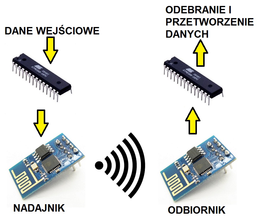 Jestem początkującym programistą, a chciałbym rozwiązać problem myślę, że prostej komunikacji pomiędzy dwoma urządzeniami. Posiadam 2 moduły ESP8266, które powinny komunikować się między sobą na zasadzie takiej, że jeden z nich jest nadajnikiem a drugi zwyczajnym odbiornikiem. Chciałem zrealizować to z wykorzystaniem dwóch mikrokontrolerów ATmega odpowiednio do ESP nadawczego i odbiorczego. Zależy mi na ciągłym przesyłaniu wartości zmiennej zawierającej liczbę albo ciąg znaków do odbiornika. Wiecie może w jaki najprostszy sposób mogę to zrealizować za pomocą tych modułów?