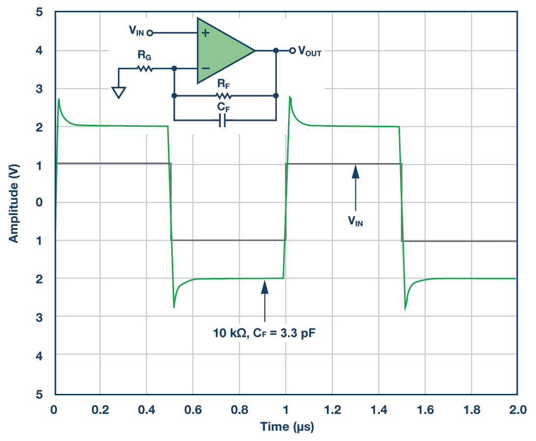 Odpowiedź: Kiedy sygnał analogowy wymaga wzmocnienia, to wzmacniacz jest komponentem pierwszego wyboru. Stosunek wartości rezystorów w dzielniku pętli sprzężenia $$R_{F}$$ i $$R_{G}$$ i w pełni różnicowy wzmacniacz określają wzmocnienie całego układu. Gdy stosunek ten jest ustalony, musimy dobrać wartość $$R_F$$ lub $$R_G$$. Wybór wartości rezystora $$RF$$ może mieć ogromny wpływ na stabilność całego wzmacniacza.