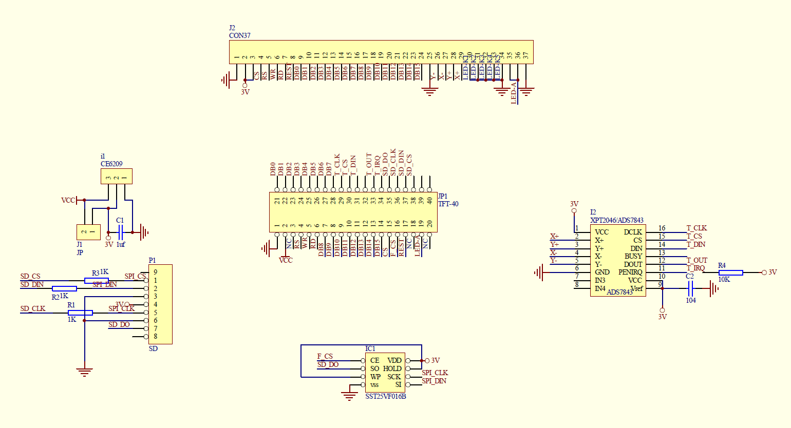 W wyświetlaczu zwarłem stabilizator, aby bezpośrednio zasilać go razem z atxmegą napięciem 3V3. Na schemacie wyświetlacz pin CS jest połączony z napięciem 3V, co w rzeczywistości nie ma miejsca.