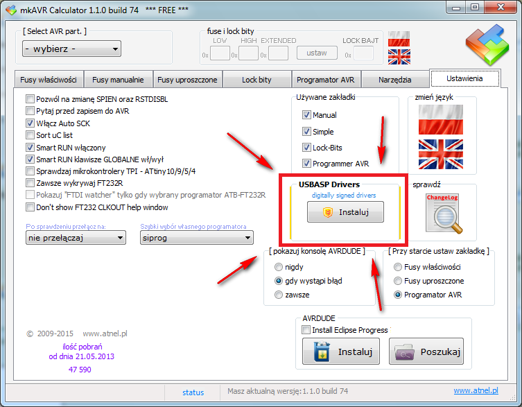 MKavrcalculator w ogóle nie wykrywa podłączonego USBasp, podobnie avrdude